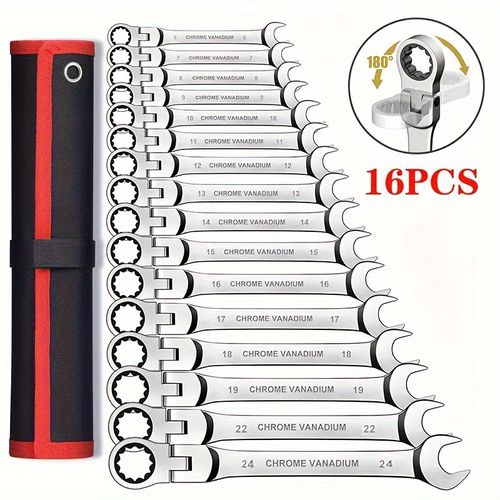Flex-Head Ratcheting Wrench Set, 16-Piece Metric Combination Wrench Set, CR-V Steel, 72-Tooth, 180° Swivel Head, with Storage Bag